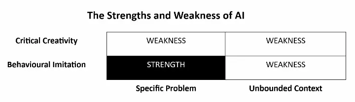 Figure 1: The strengths of artificial intelligence are limited to imitating solutions to specific problems within a bounded area. It still lacks genuine creativity and understanding in unbounded contexts.