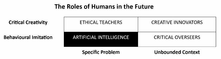 In the future, the role of humans is to be a creative innovators who questions the existing ways of working and normative objectives. Therefore, humans are needed for formulating new types of questions and prioritizing objectives rather than executing the reasoning paths or performing routine tasks.